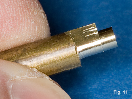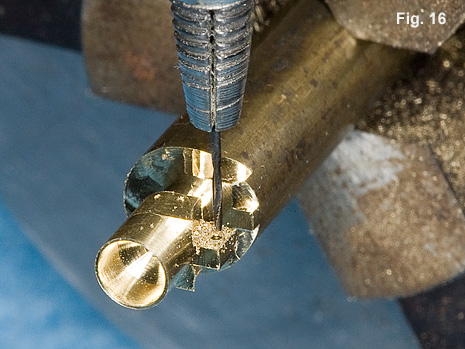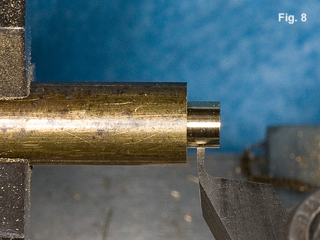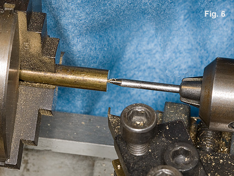 A piece of brass rod stock is chucked in the lathe and the center spotted prior to drilling, Fig. 6. The hole is then drilled, Fig. 7. The basic outside diameter is established on the lower half below where the dog will take off.