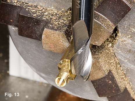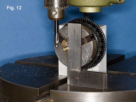 The rod stock is removed from the lathe and mounted in an indexing head to continue milling the final shape of the dog, Fig. 12. The alignment of the part is checked with a square. The width of the dog is established, Fig. 13. This step is done in the mill because it is more rigid and precise. I can also visualize and control the milling better than when mounted in the lathe.