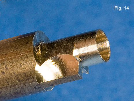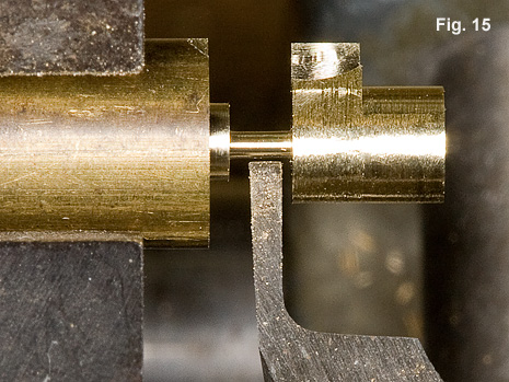 Figure 14 shows the results of the machining processes so far. The actual height of the piece is established on the lathe, Fig. 15. (note: this particular photo was created to simply show this step in the process; it does not have the angled curve that should be present where the dog meets the main body of the cap)