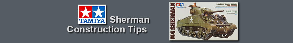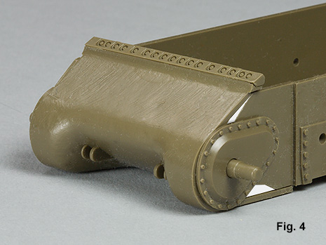 All Tamiya Sherman VVSS kits use the same lower hull that is molded to fit the three piece transmission and final drive housing, Fig 1. This results in a fairly cobbled together appearance when used with the later single piece housing, Fig 3. The solution here is to fill the areas with sheet styrene before assembly and then remove the dog-ear off the transmission cover, Fig 4.